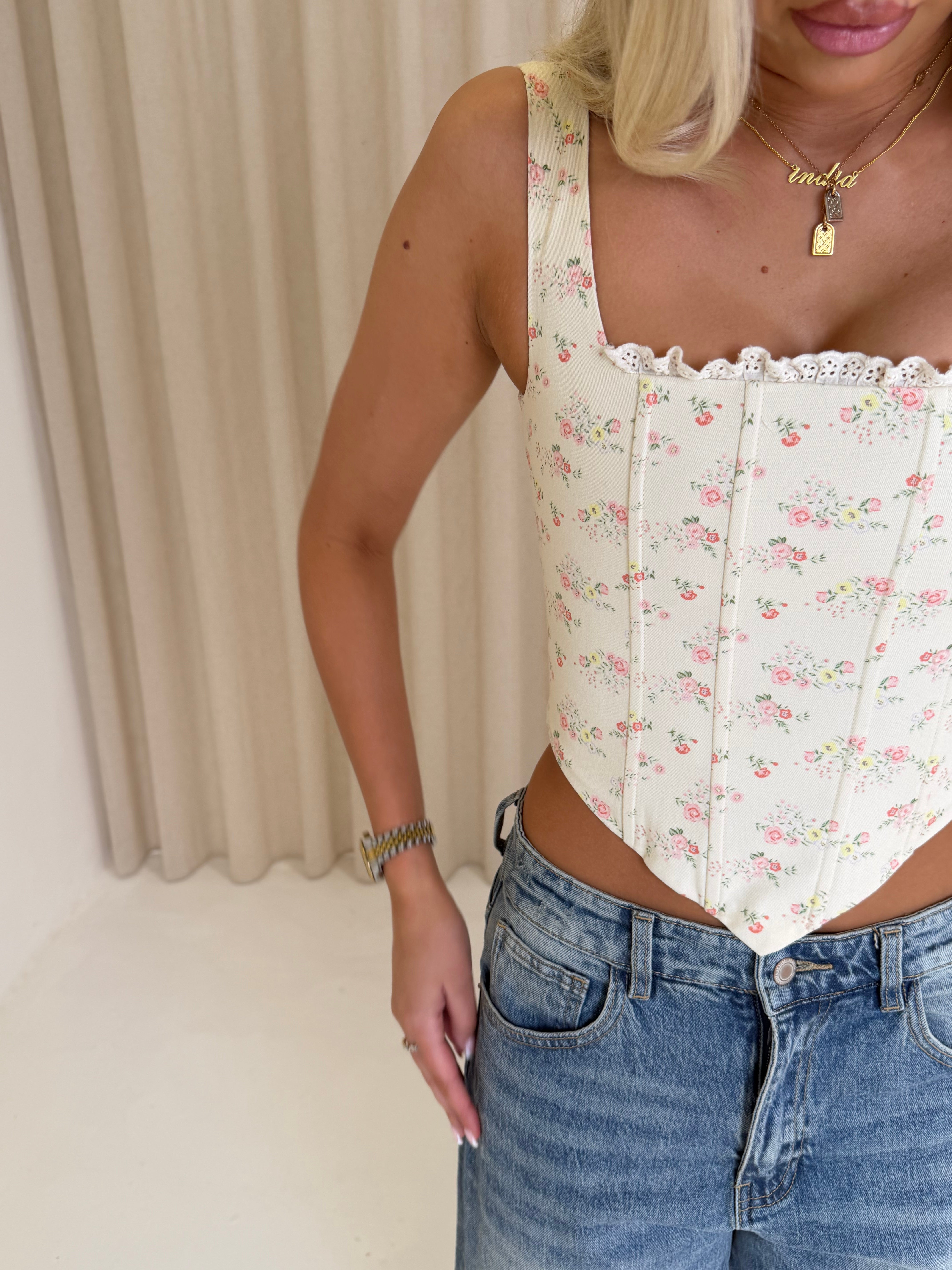 Our Anais Floral Corset is designed in a delicate ditsy floral print with soft lace trim detailing for the ultimate feminine finish. Featuring a structured, figure-enhancing silhouette, this corset cinches the waist while flattering the bust for a beautifully sculpted shape.