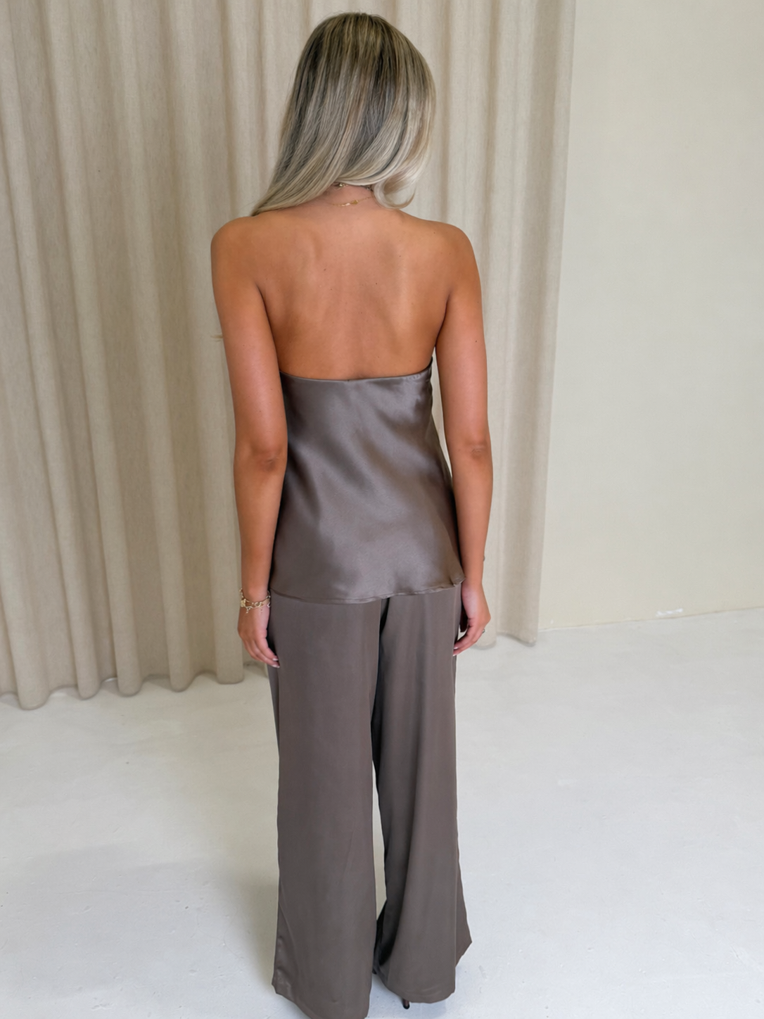 Our Seren Satin Co-Ord is designed in a luxe fabric that drapes effortlessly over the body. Featuring a bandeau top and an open back detail, paired with wide-leg trousers for a sleek, elongated silhouette.
