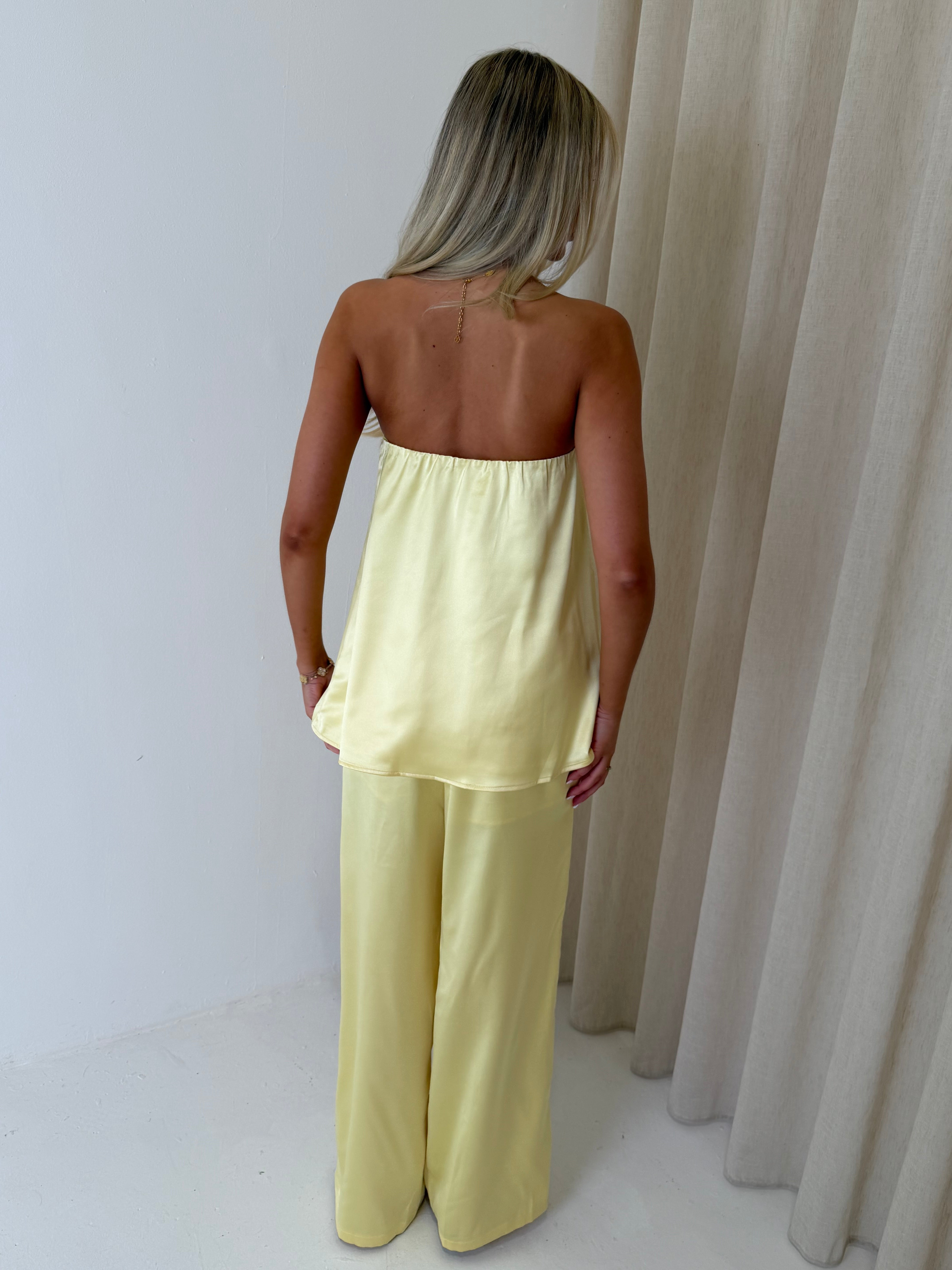 Featuring a sleek bandeau-style top with a soft drape finish, paired with relaxed wide-leg trousers, this set blends comfort with understated luxury. The elasticated waistband with adjustable tie ensures the perfect fit, while the silky satin fabric catches the light beautifully for a soft, glowing finish.