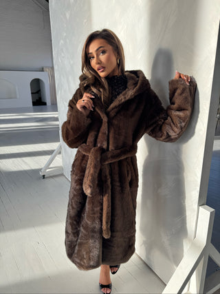 ASPEN Long Faux Mongolian Collared Coat In Chocolate Plum