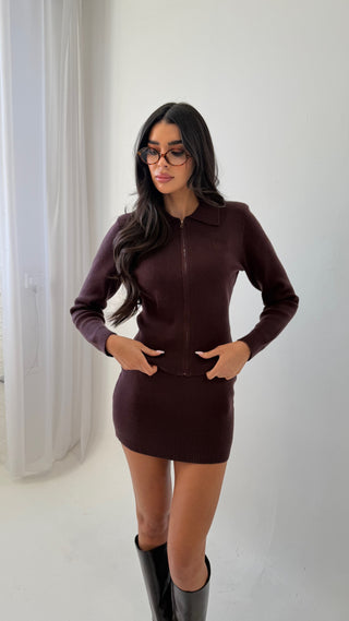 Caramella CAMILLE Knit Button Up Collared Cardigan & Mini Short Co-Ord In Chocolate