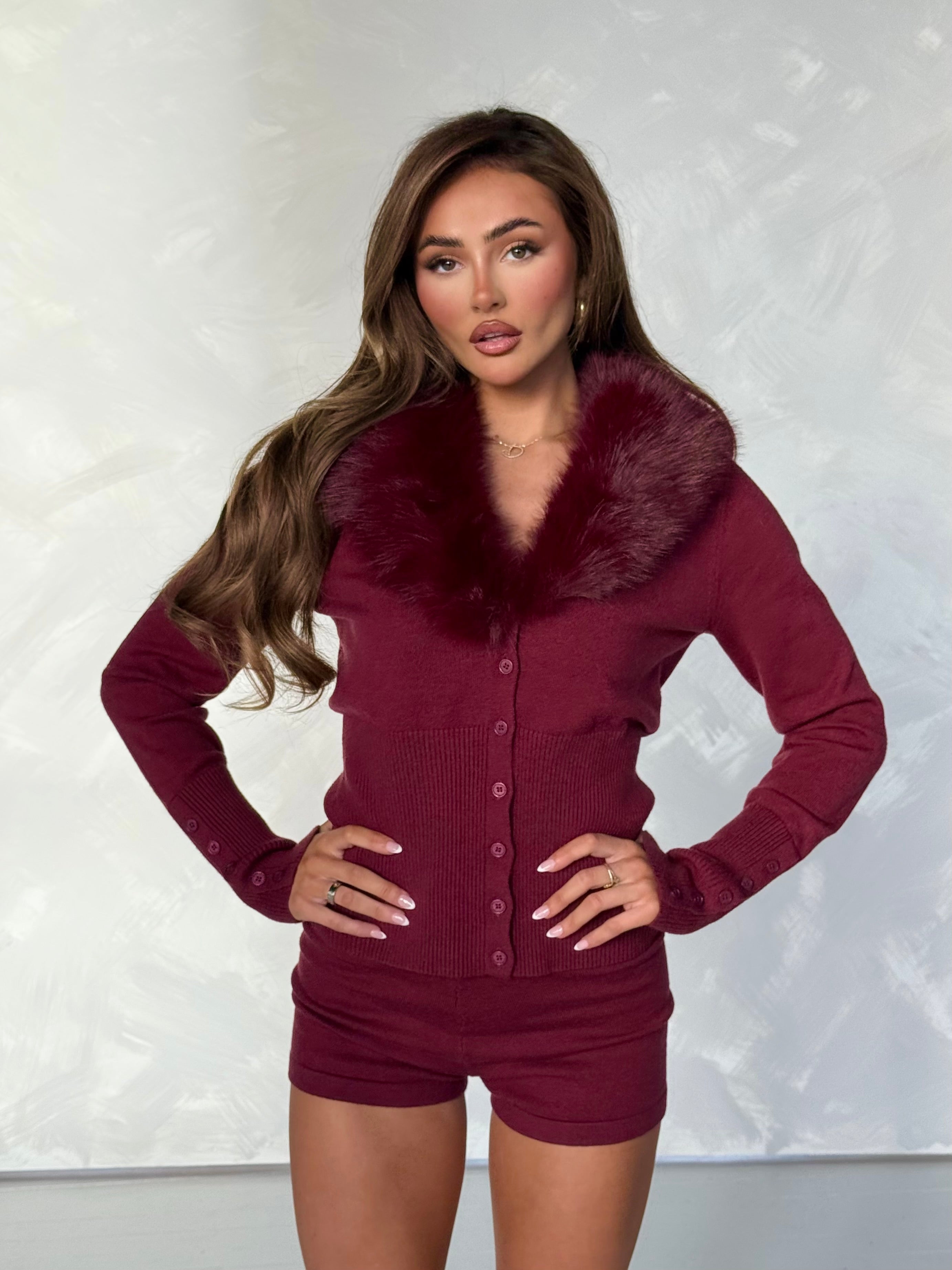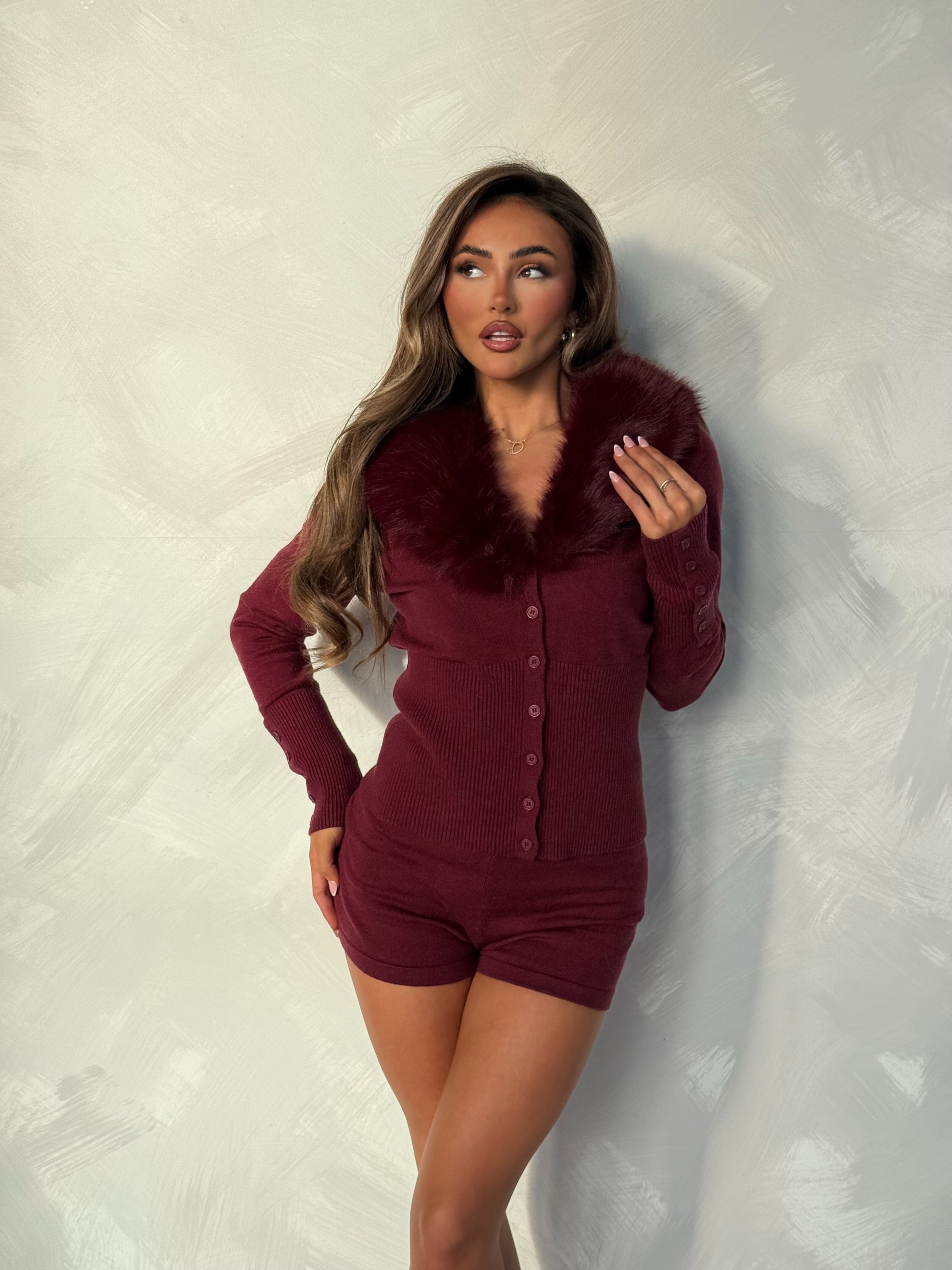 Caramella CINDY Knitted Faux Fur Collared Jumper & Mini Shorts Co-Ord In Burgundy