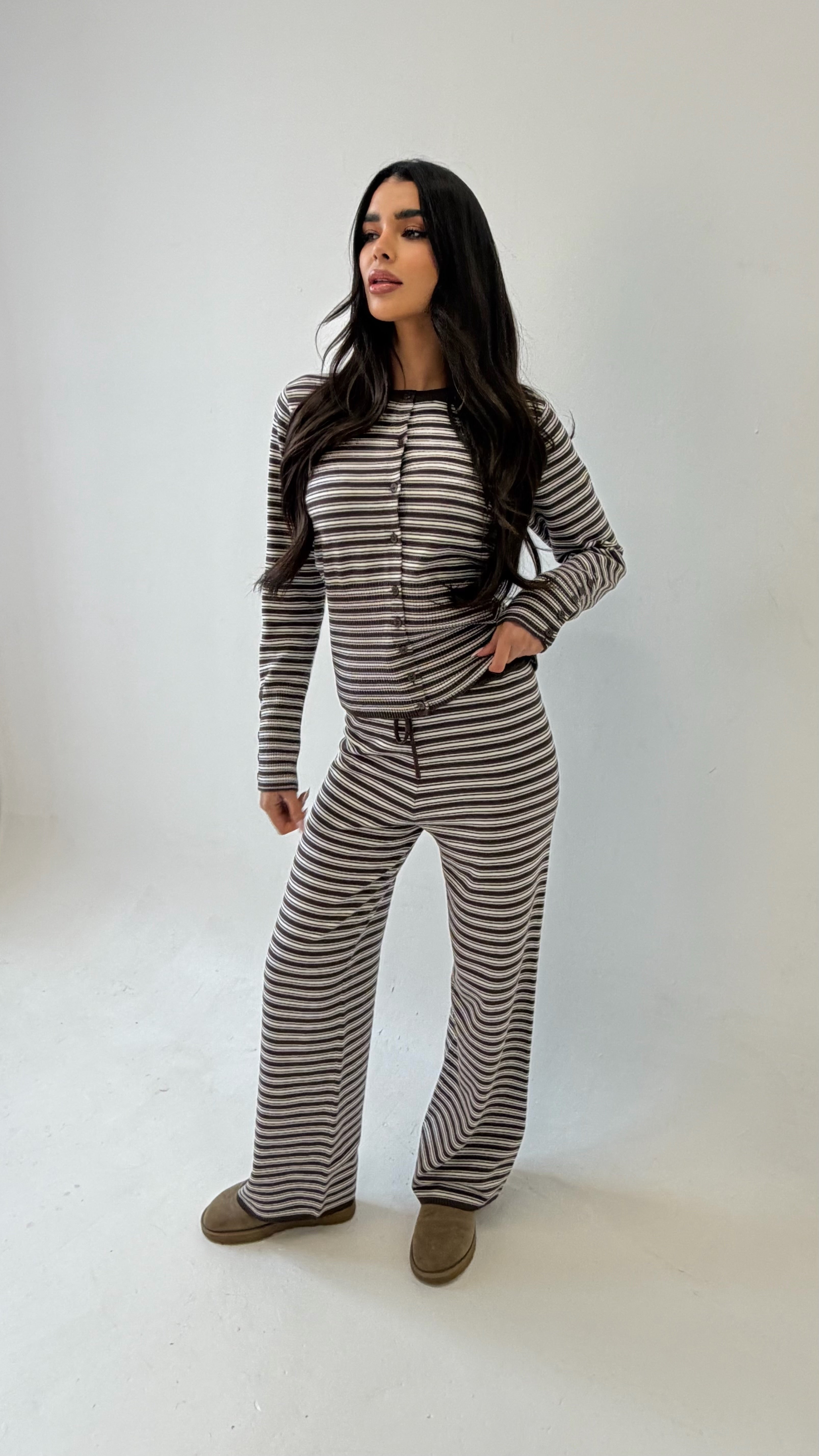 Caramella EVERLY Stripe Knitted Button Cardigan & Wide Leg Trouser Lounge Set In Mocha Stripe