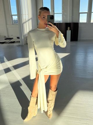 HAZEL Cheesecloth Long Sleeved Bardot Tie Up Mini Dress In Coco