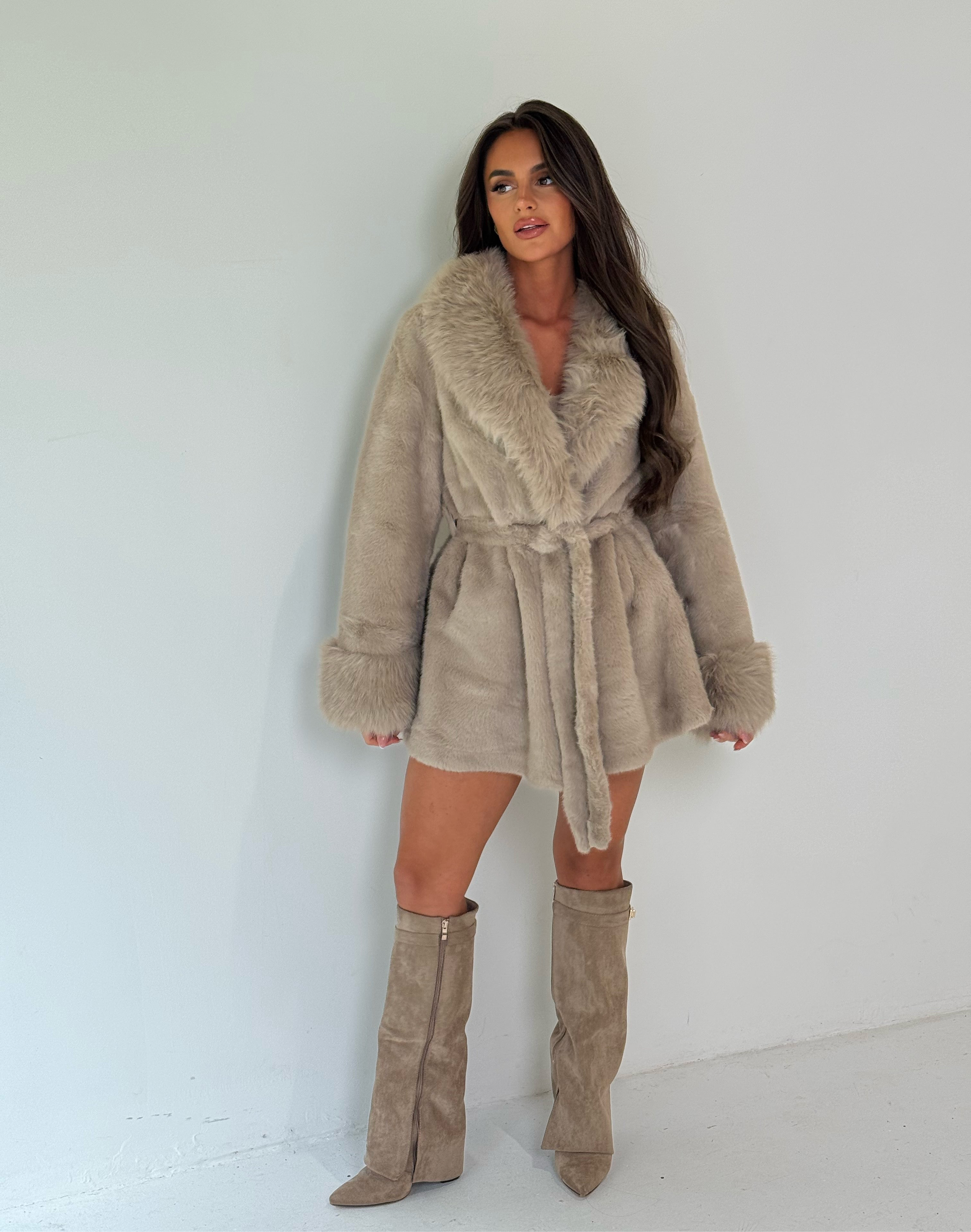 EMBER Faux Fur Collar Detail Tie Waist Coat In Toffee