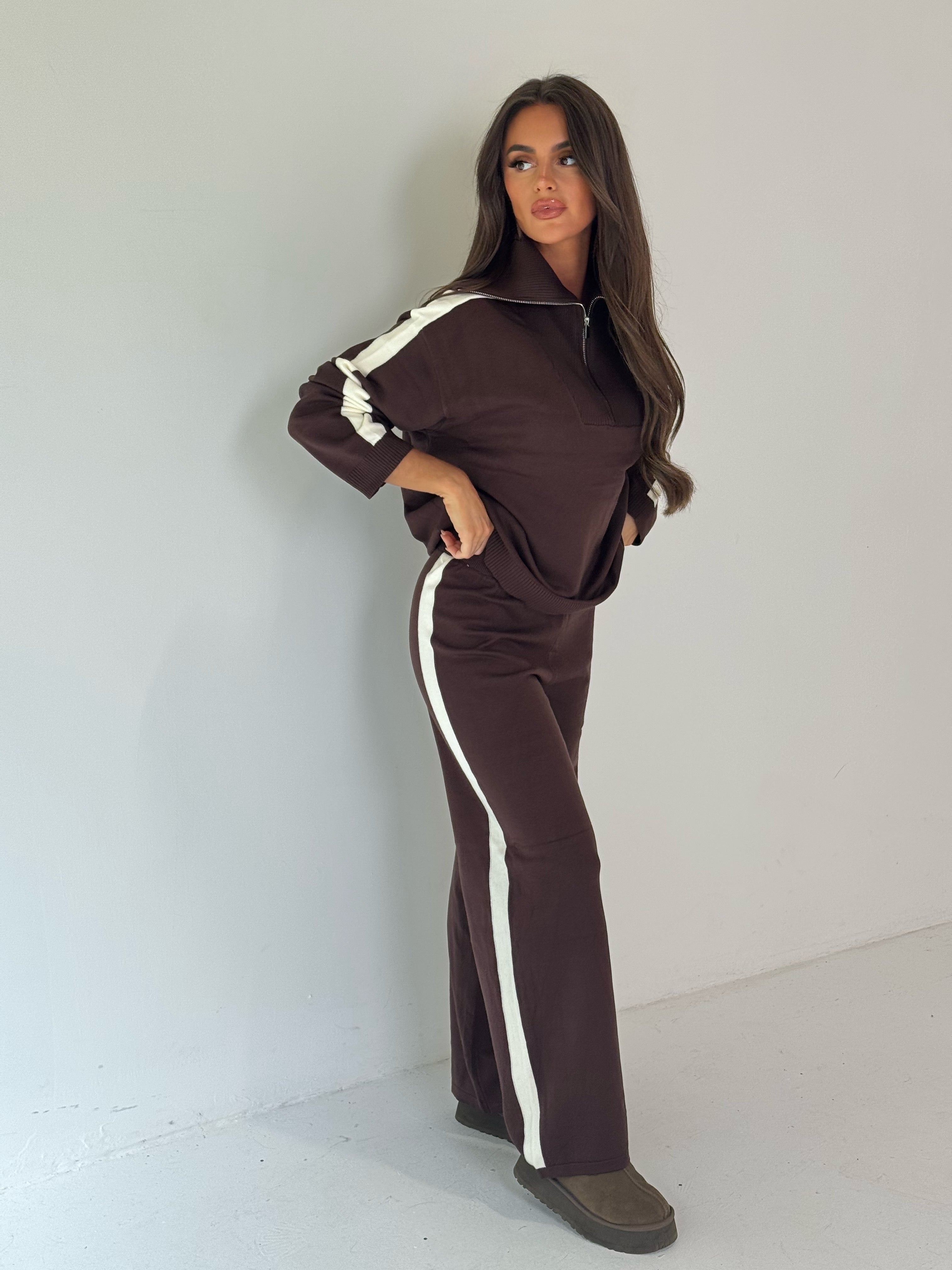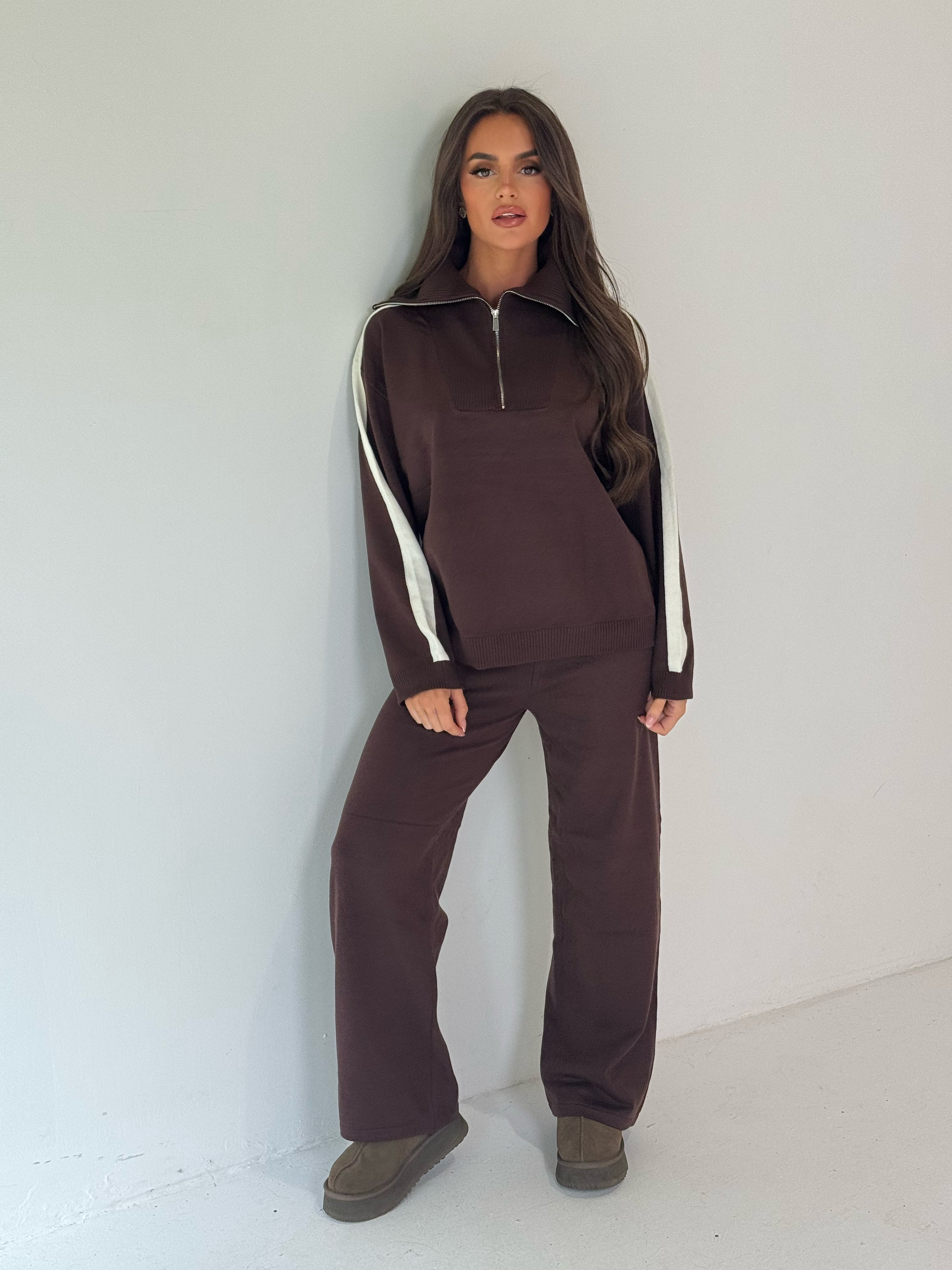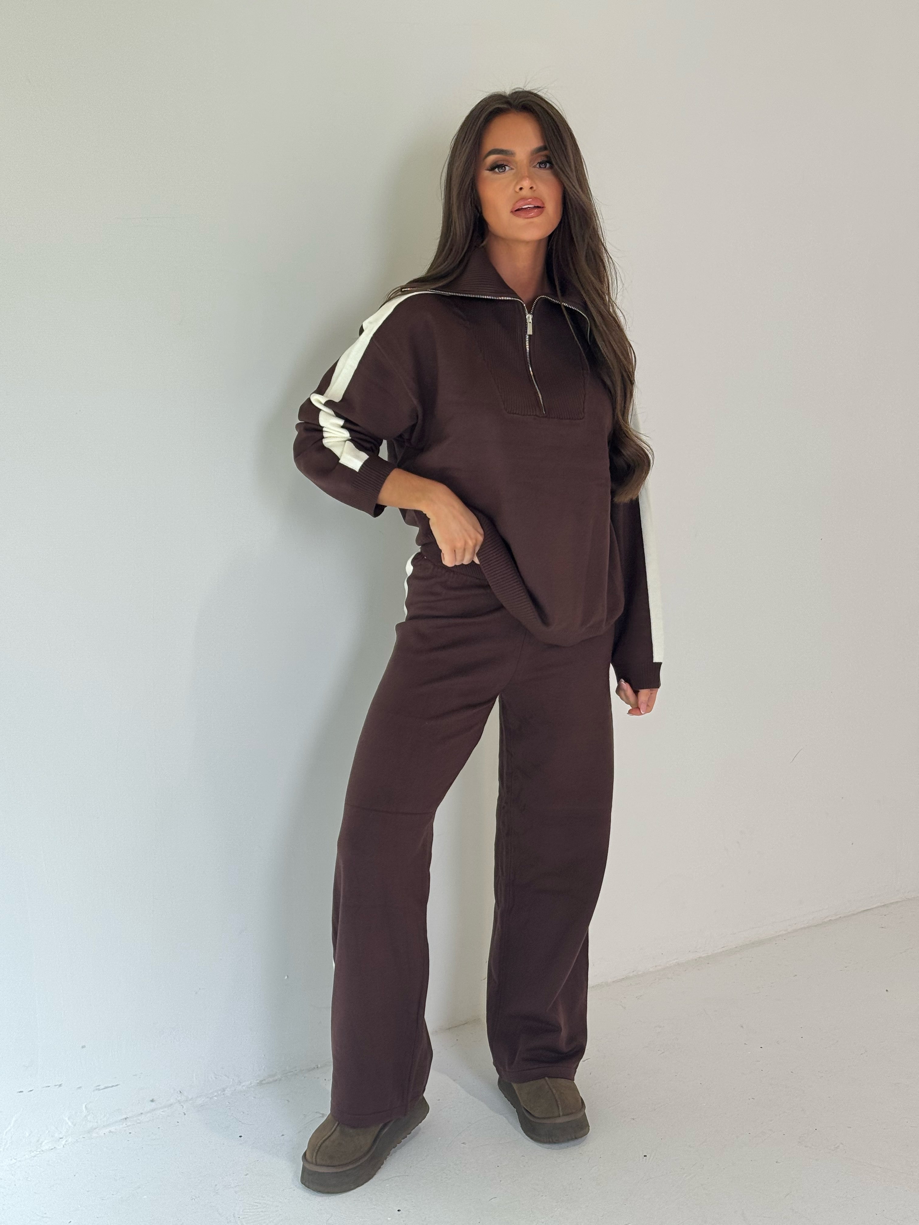 MARLIE Knitted Zip Up Jumper & Wide Leg Trouser Loungewear In Mocha