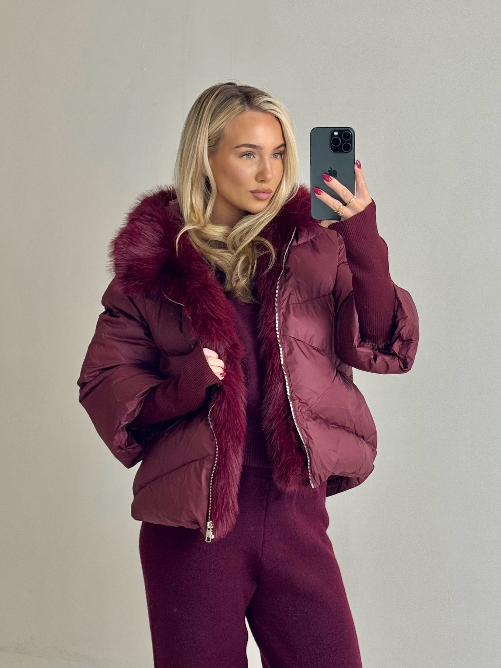 ALASKA Long Sleeved Puffa Jacket Faux Fur Hood In Burgundy