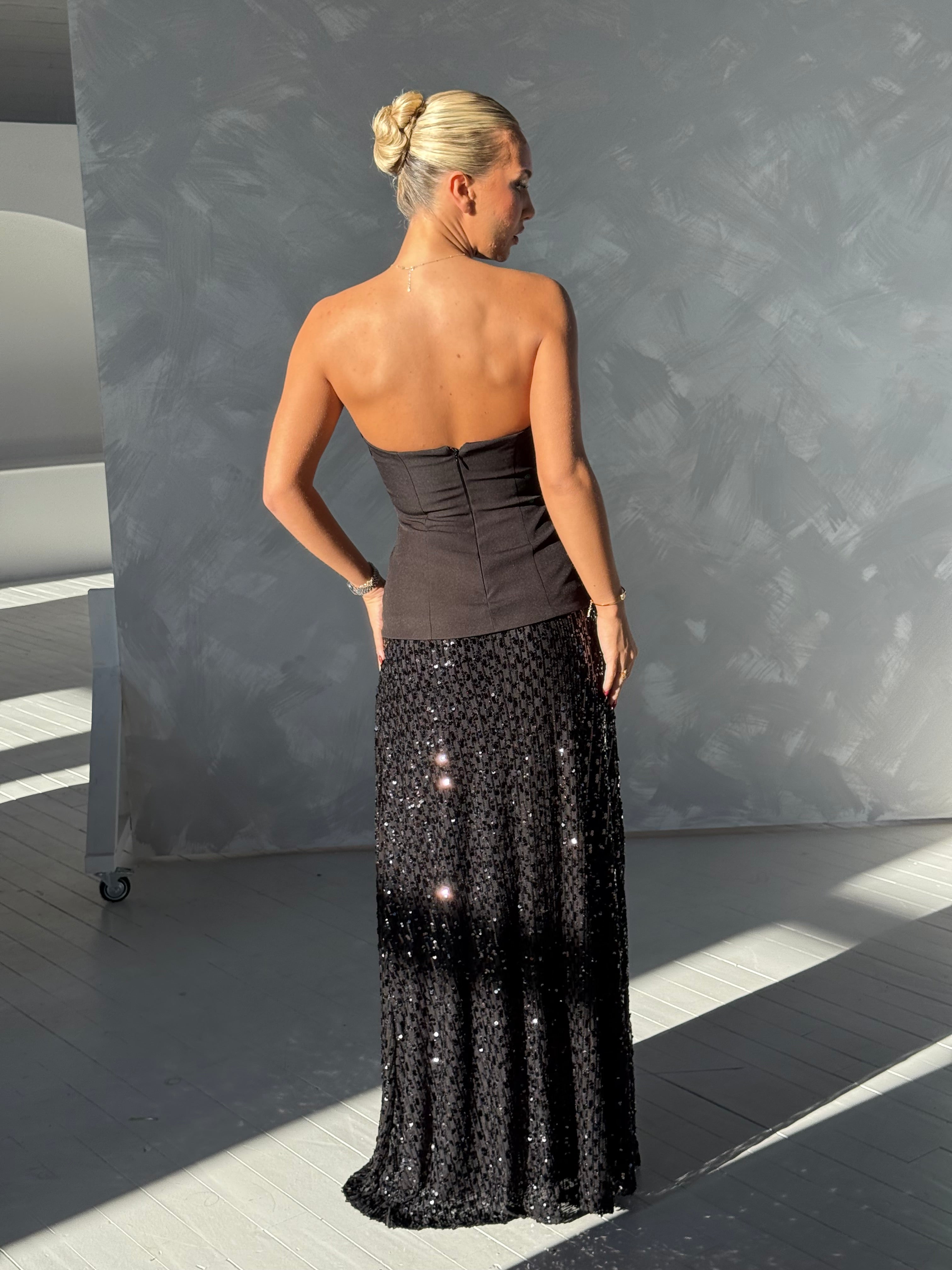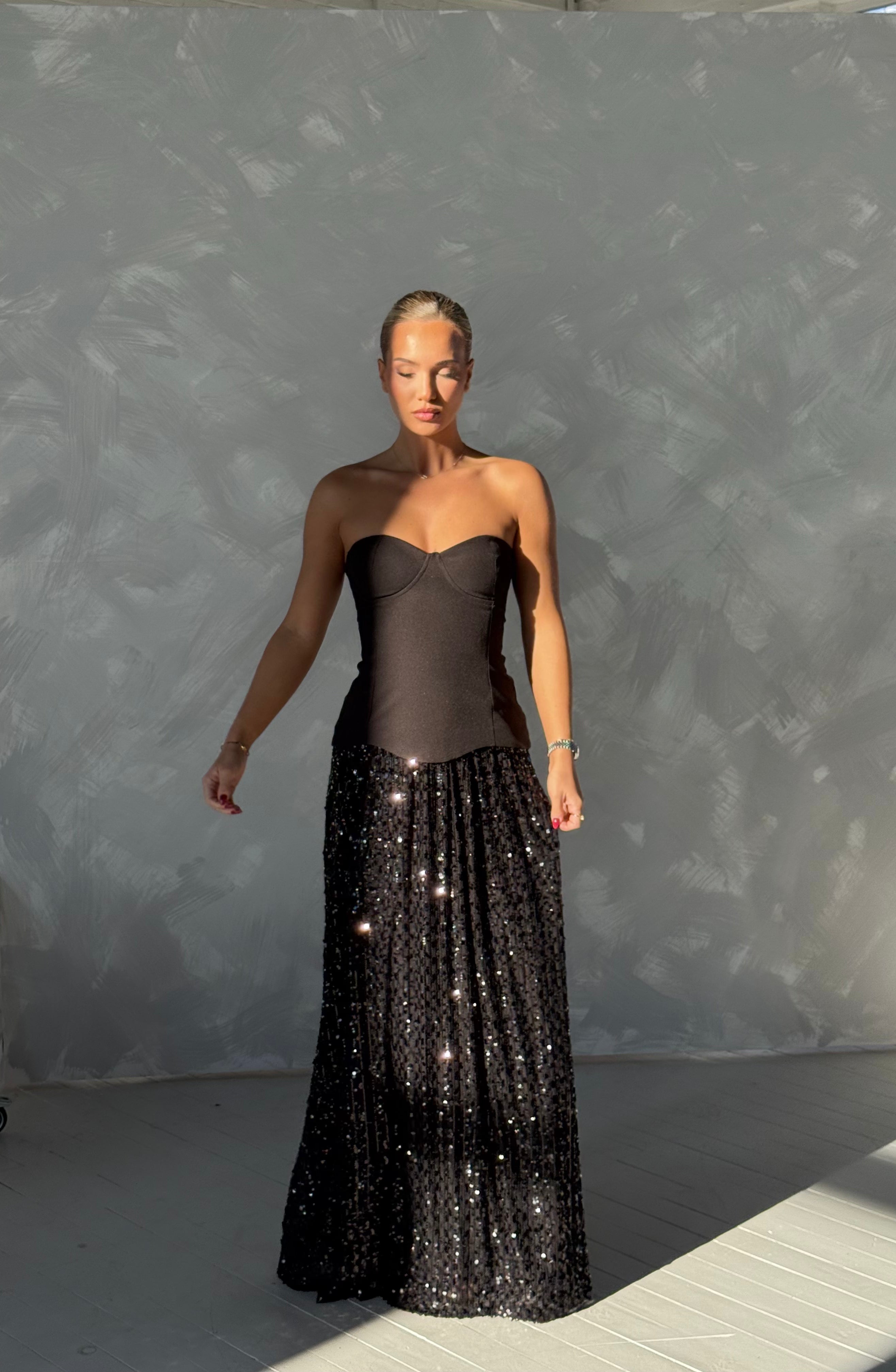 Turn heads in our brand new Bandeau sequin dress. Designed to sculpt your figure in our brand new maxi dress.