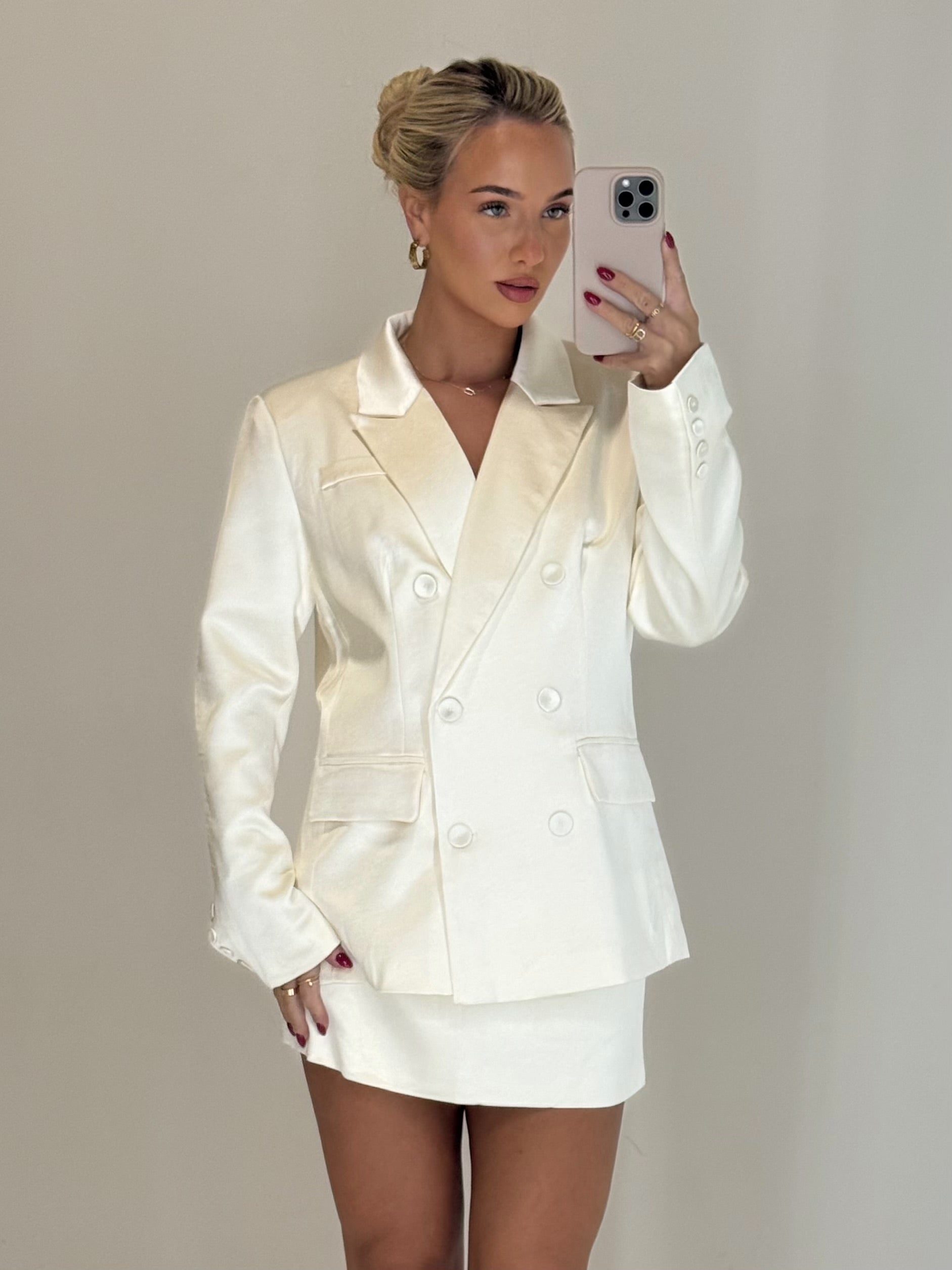 Introducing our brand new CELINA satin look double breast tailored blazer + skirt co ord.