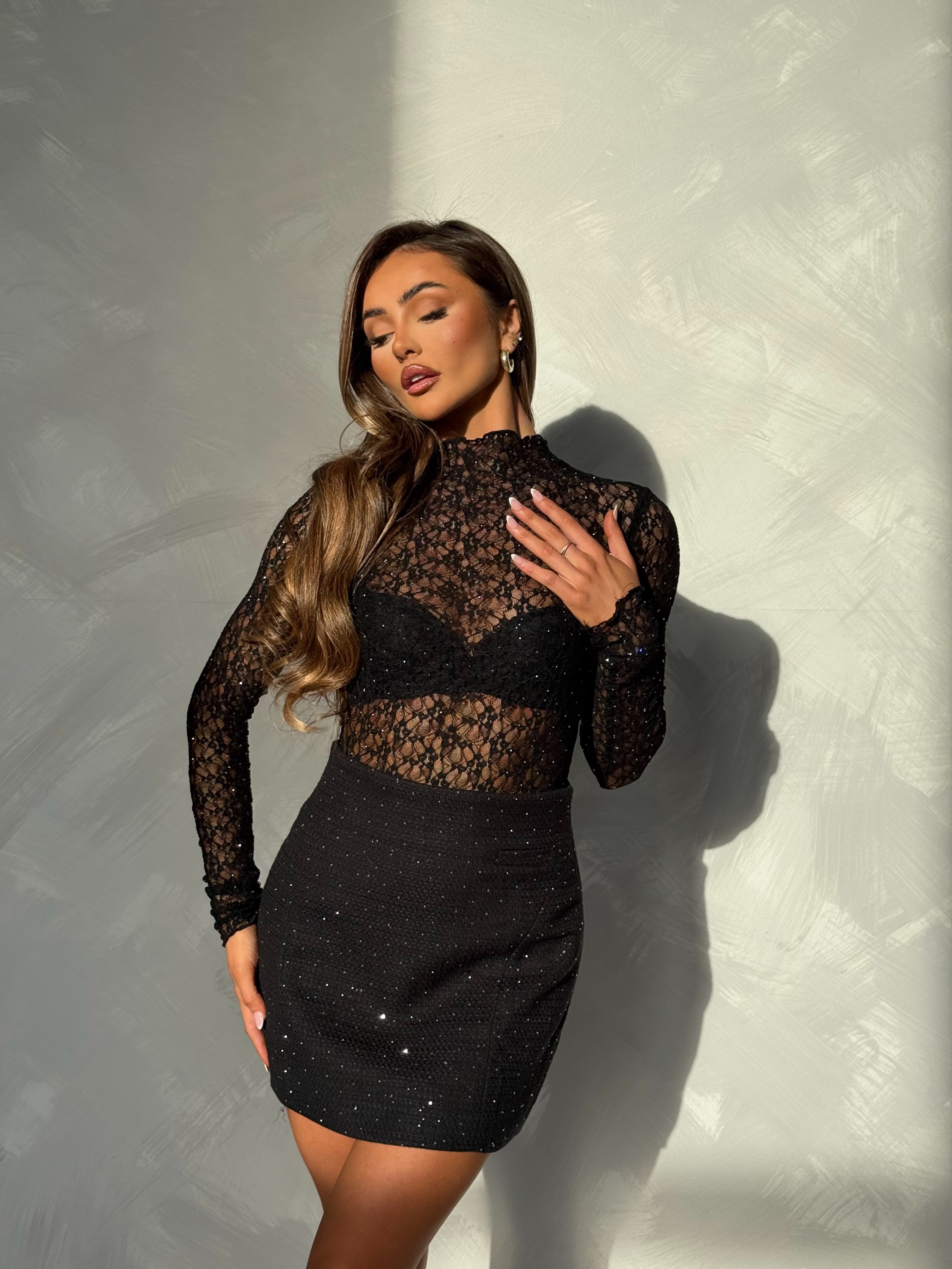 Introducing Maura. Our brand new lace bodysuit with diamanté embellished detail. Pair with our brand new mini skirt for the perfect match.