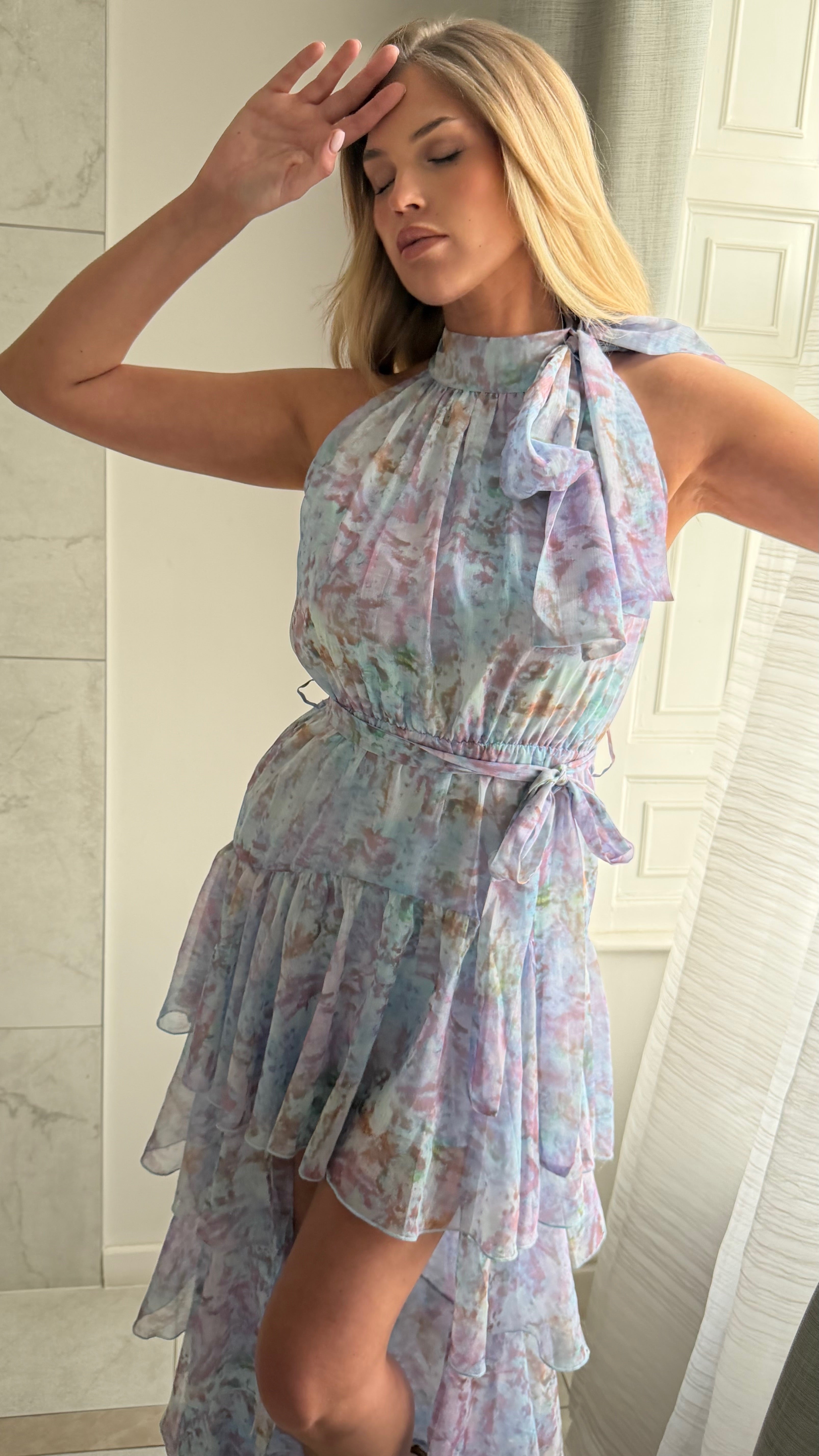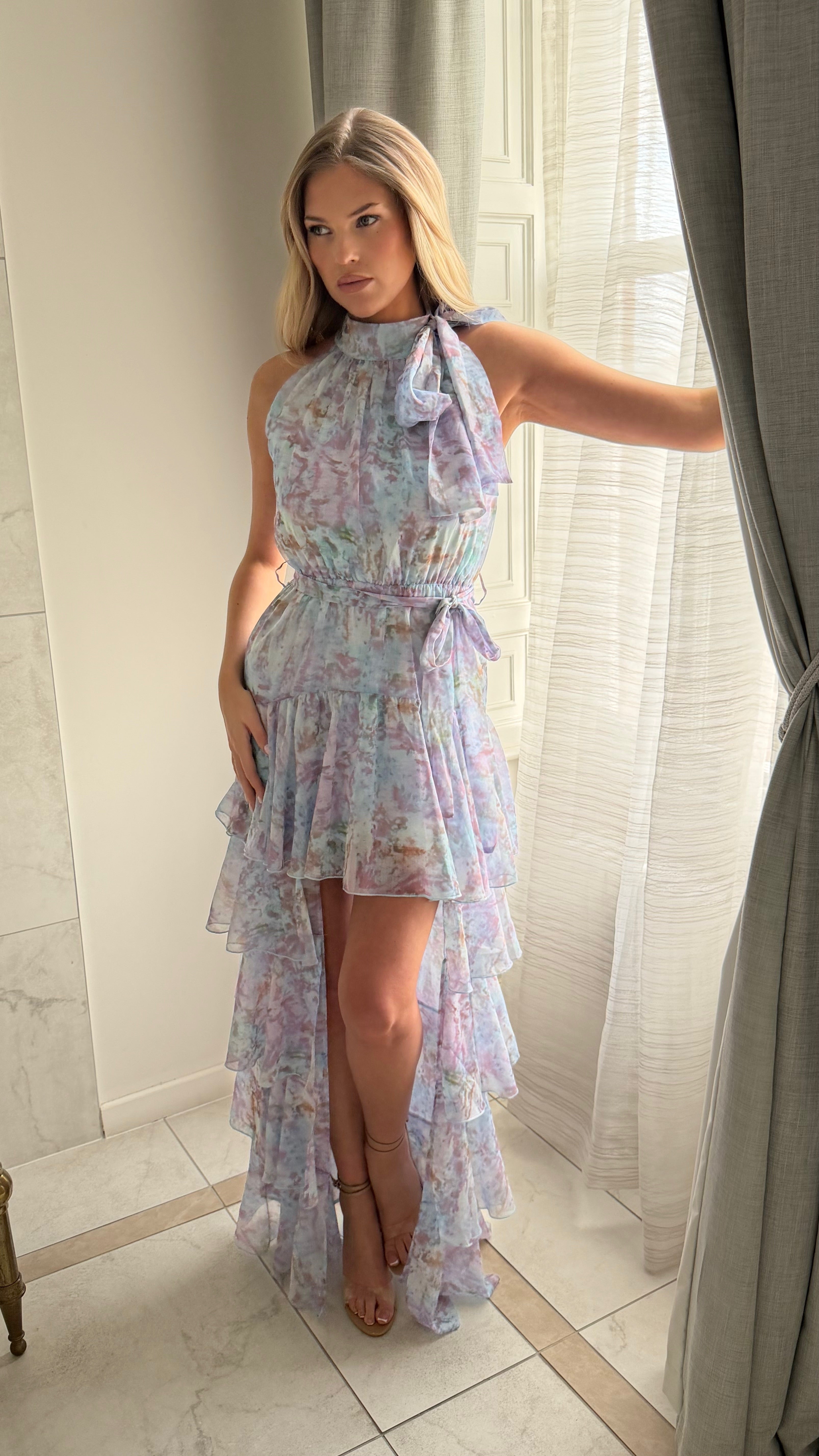 Soft, romantic and beautifully feminine, our SERAPHINA Floral Tiered Halter Dress is designed to move effortlessly with every step. Crafted from a lightweight, chiffon fabric, this dress features a delicate halter neckline with an elegant tie detail, creating a flattering and refined silhouette.
