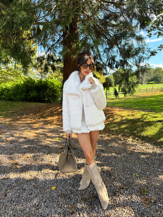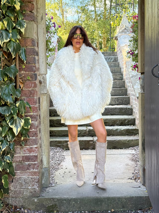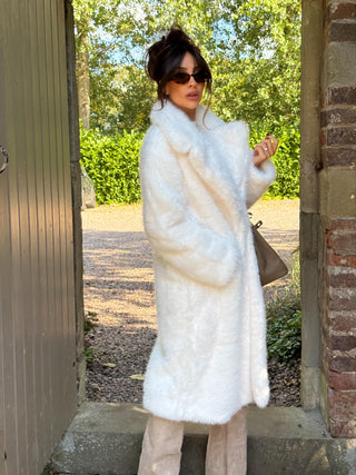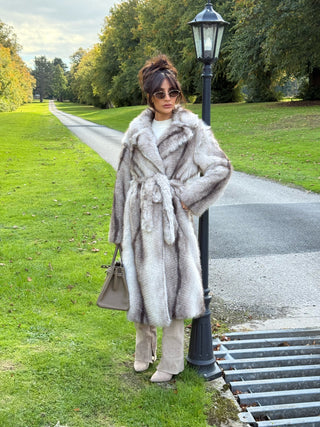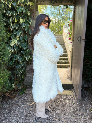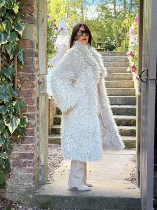 PRE ORDER SHIPE WITHIN 2 WEEKS FALLON Longline Faux Fur Coat with Belt in Marble Snow