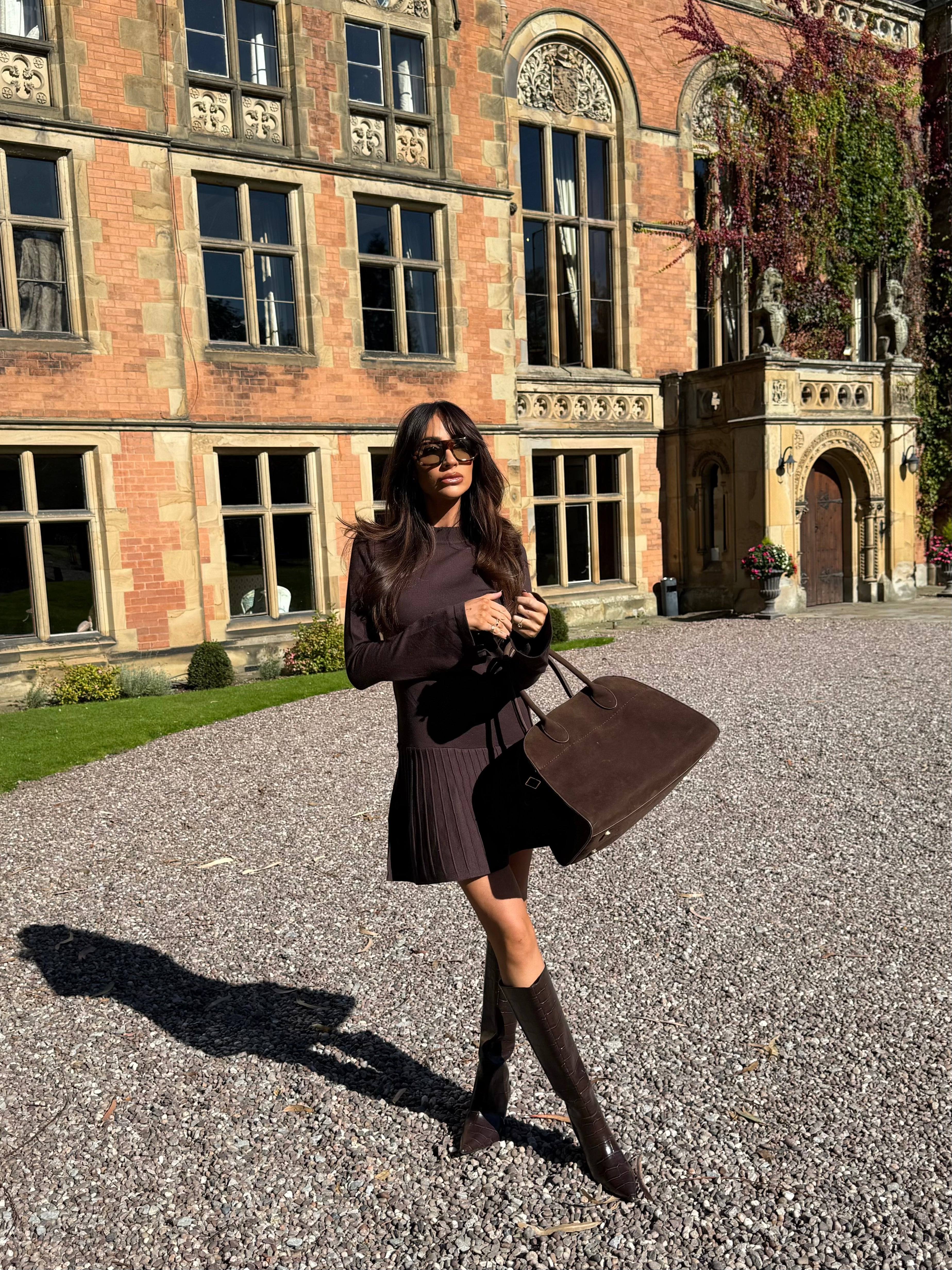 MAEVE Long Sleeved Knit Pleated Mini Jumper Dress In Chocolate