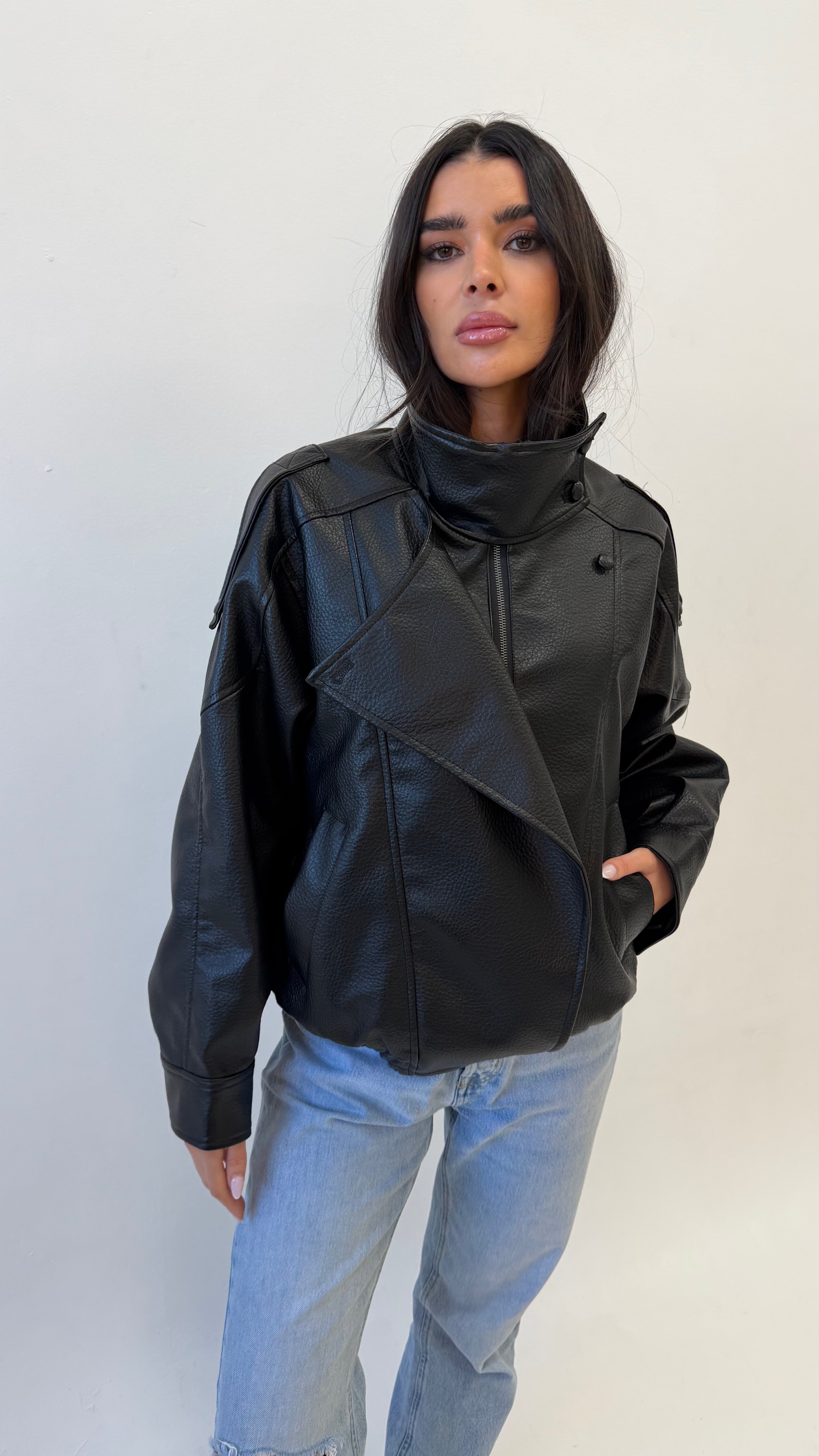 Meet Imani. Elevate your outerwear with this sleek PU leather look jacket.