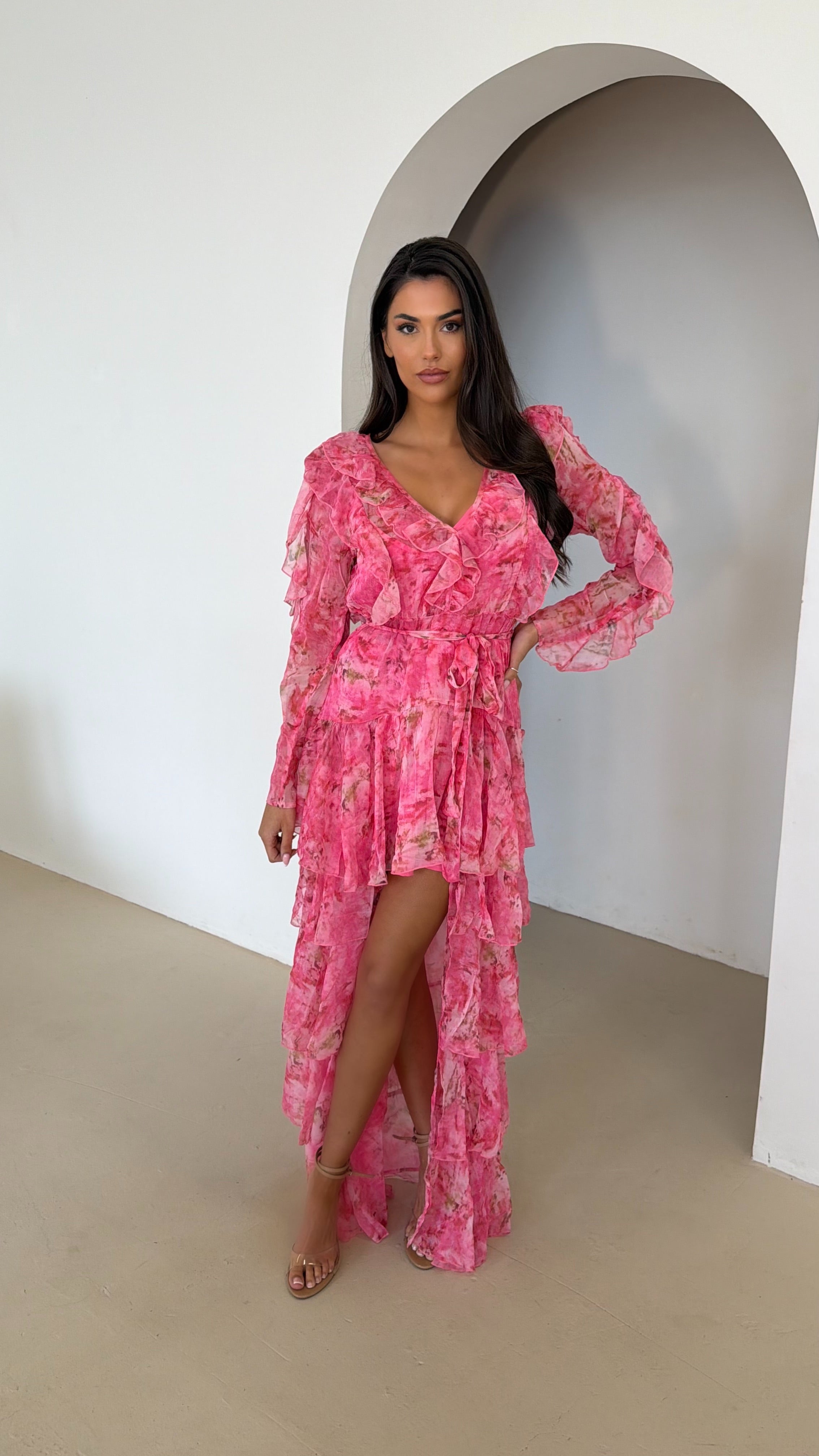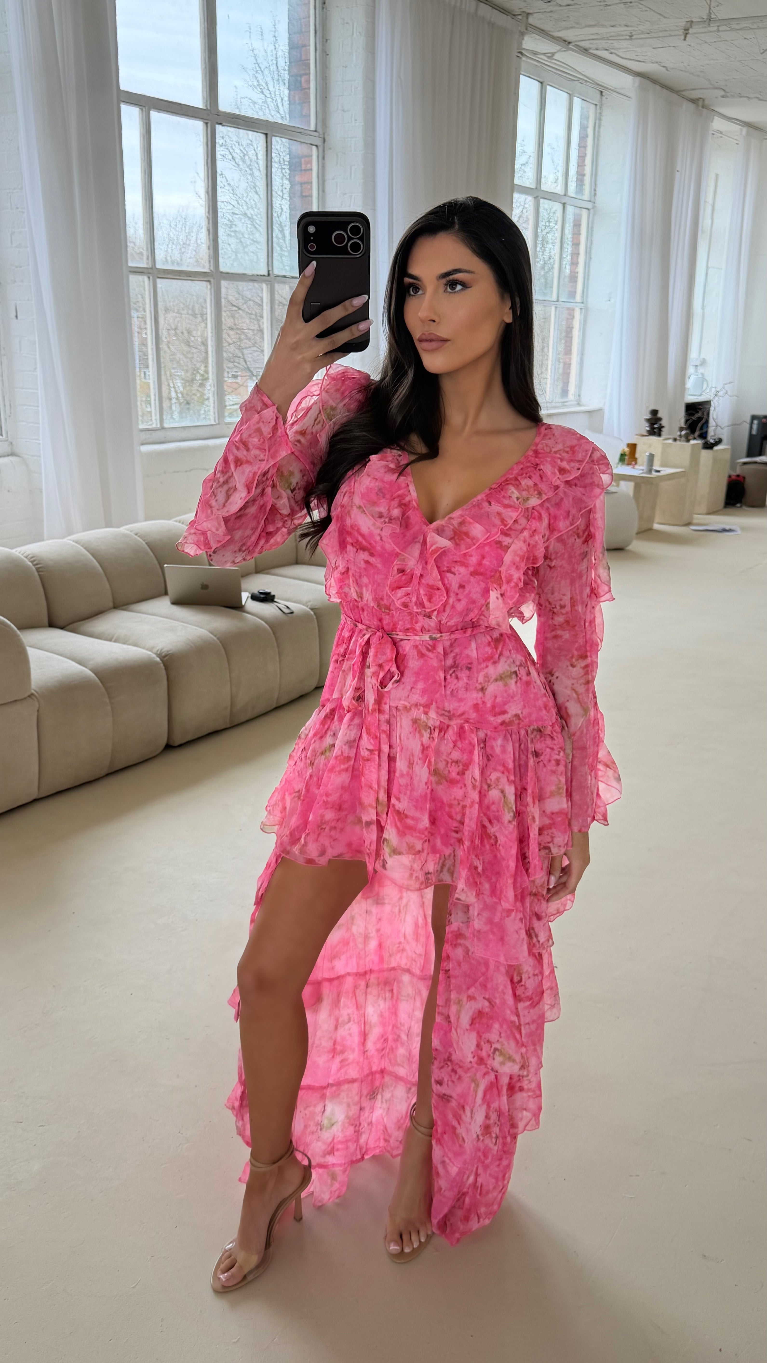 The perfect wedding guest outfit has just arrived! Our Long sleeved sheer maxi ruffle dress is the perfect staple in your wardrobe. Featuring a sheer chiffon fabric with an elastic waist to sinch you in and tie belt detailing.