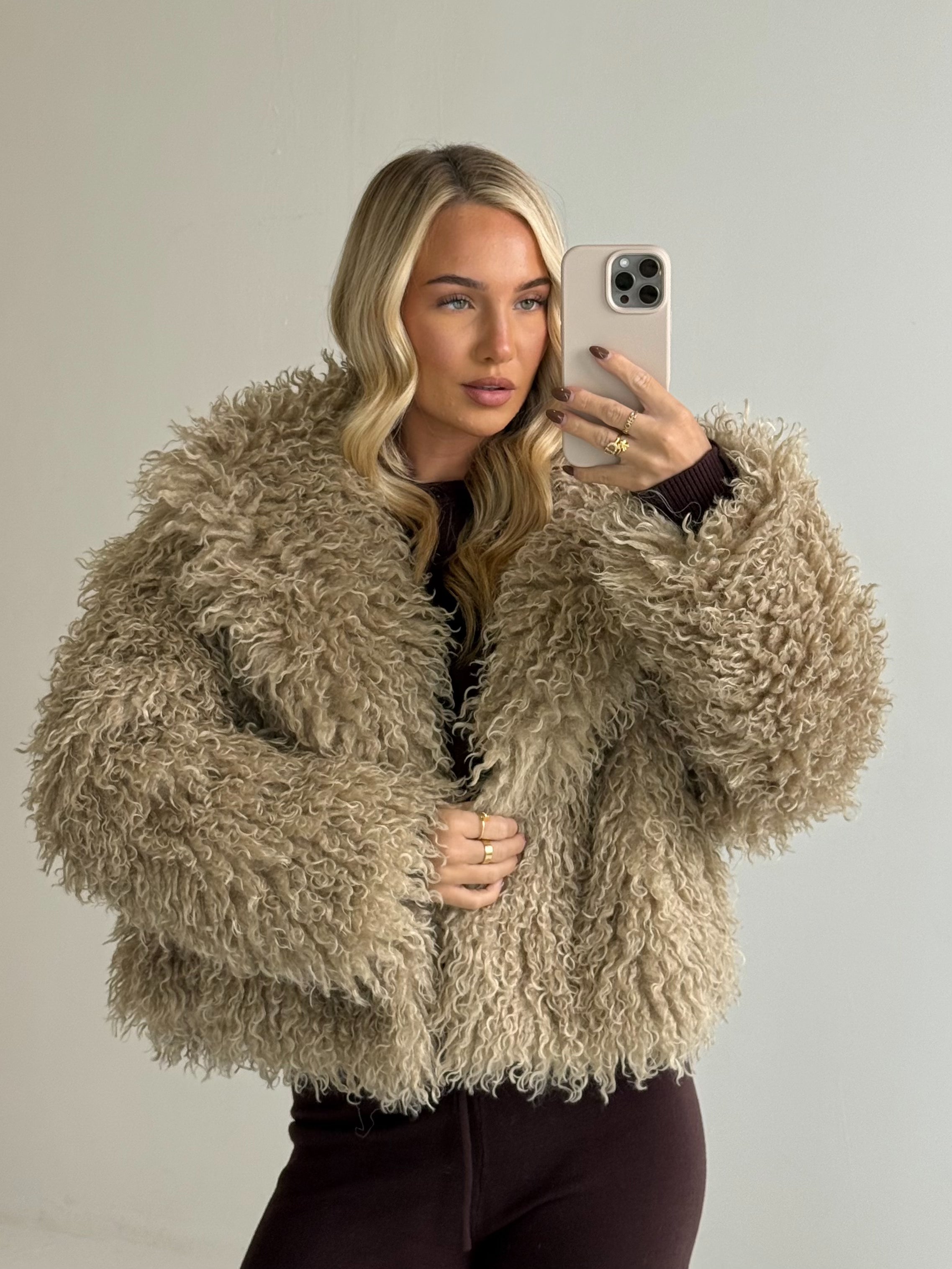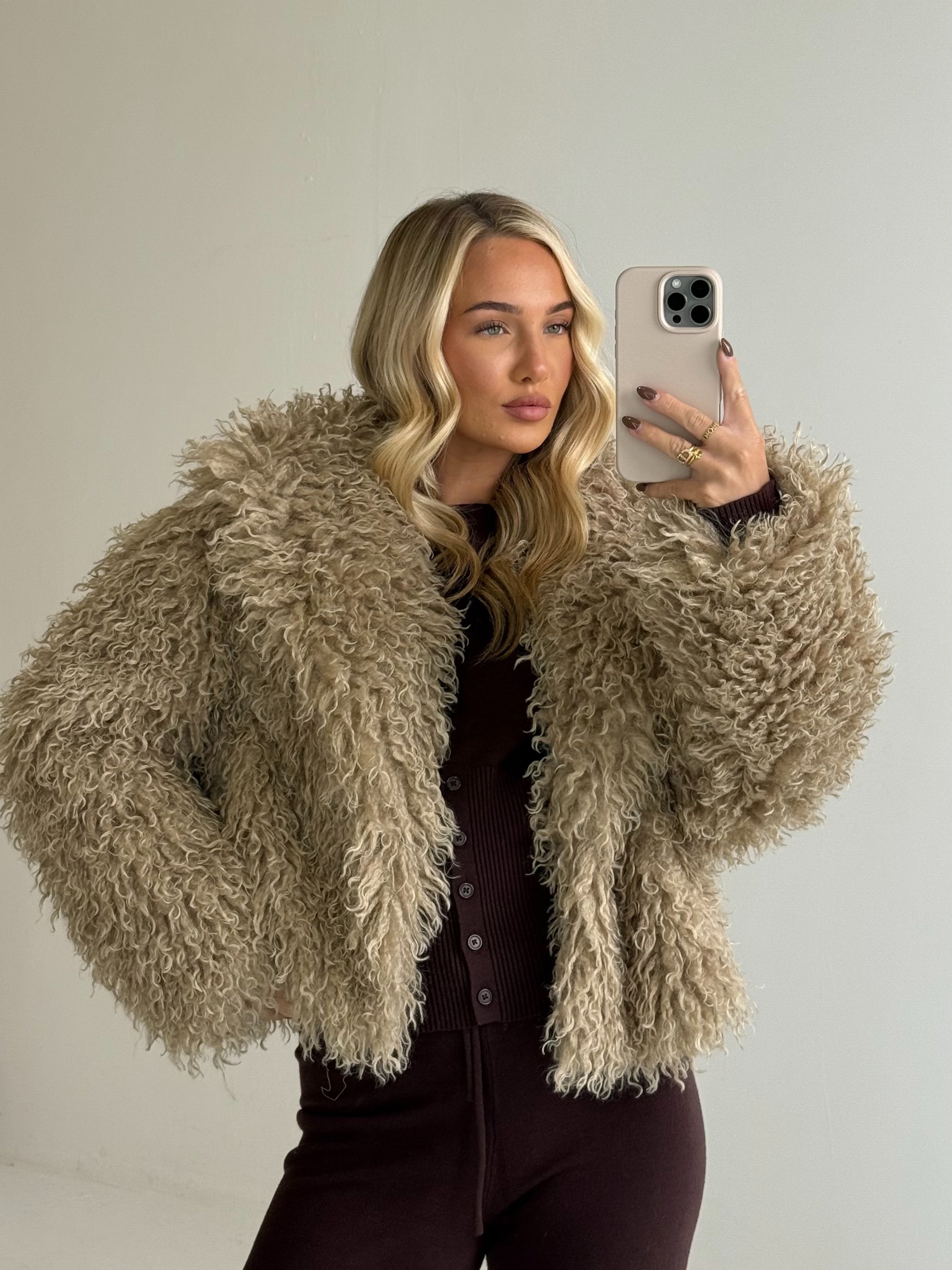 KENDALL Long Sleeved Shaggy Mongolian Cropped Jacket In Biscuit